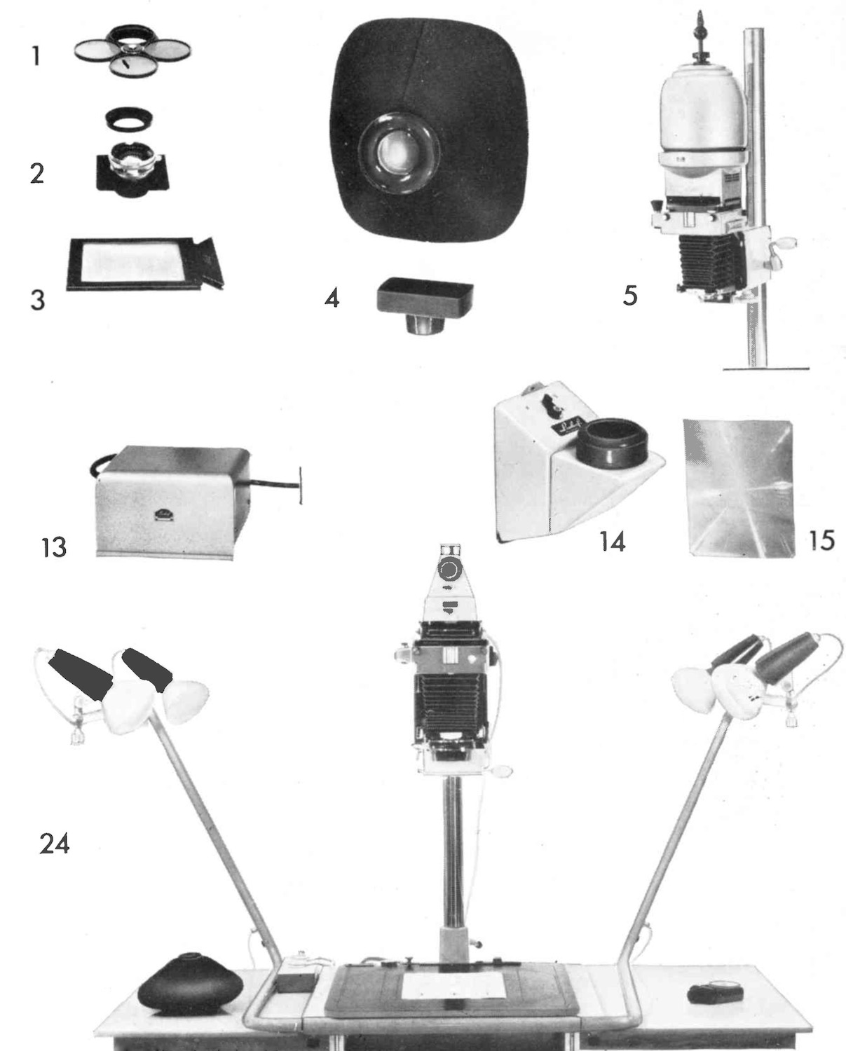 写真:5) Condenser enlarging head, 13) cold light enlarging head.