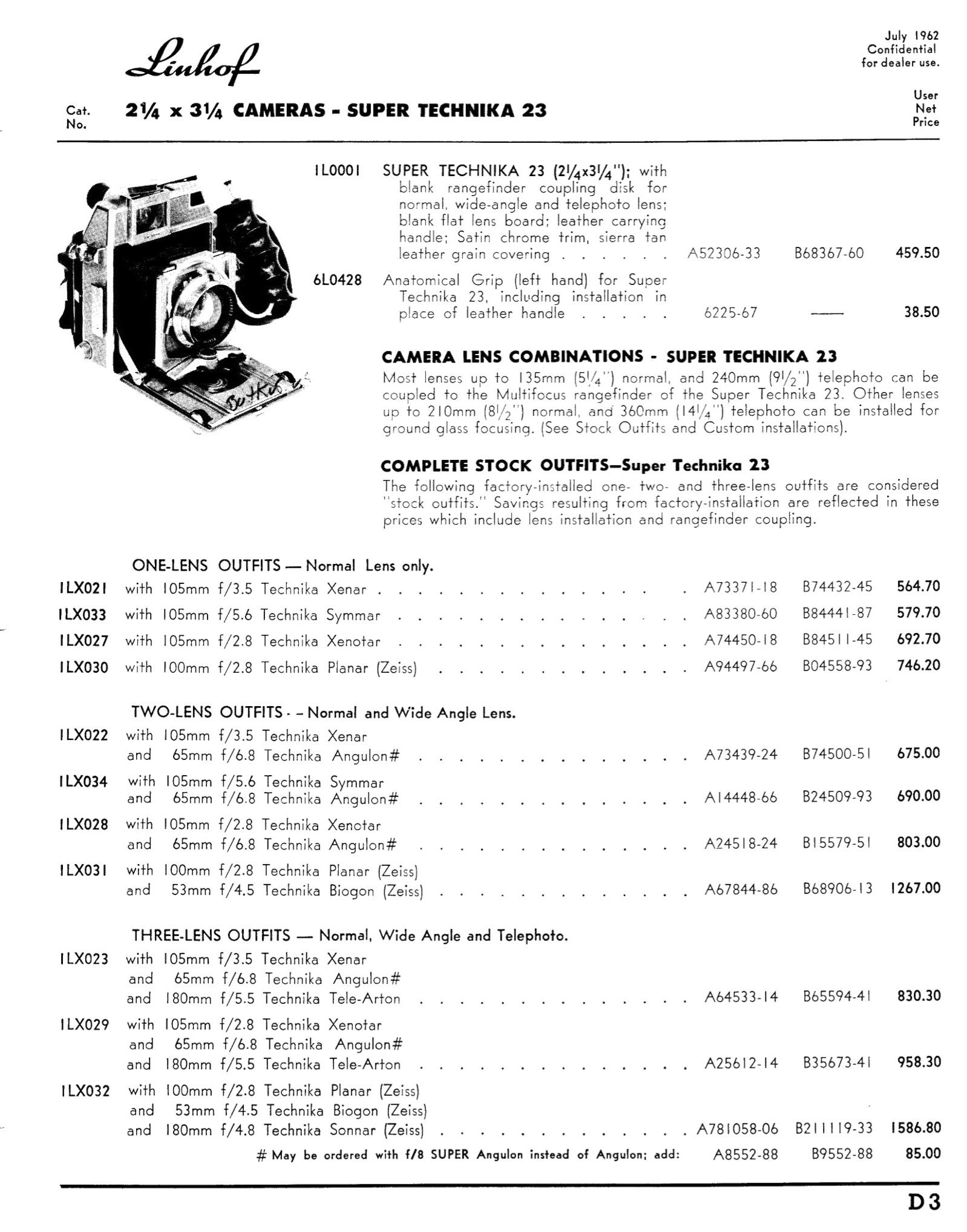 これら往年の名レンズの内,ビオゴン,スーパーアングロン,プラナー,ジンマー,ゾナー,テレアートン,ロテラーはIVの発売に合わせて開発された新レンズと思われる。アヴスの所で日浦様が指摘されているように,リンホフの依頼で製造された専用レンズと思われる。特にカールツァイスが製造したビオゴン,プラナー,ゾナーの3本セットは当時の最高品質とされ人気があったが,重く高価なレンズでもあった(1956年当時で3本とテヒニカIVのセット価格:$1245)。
