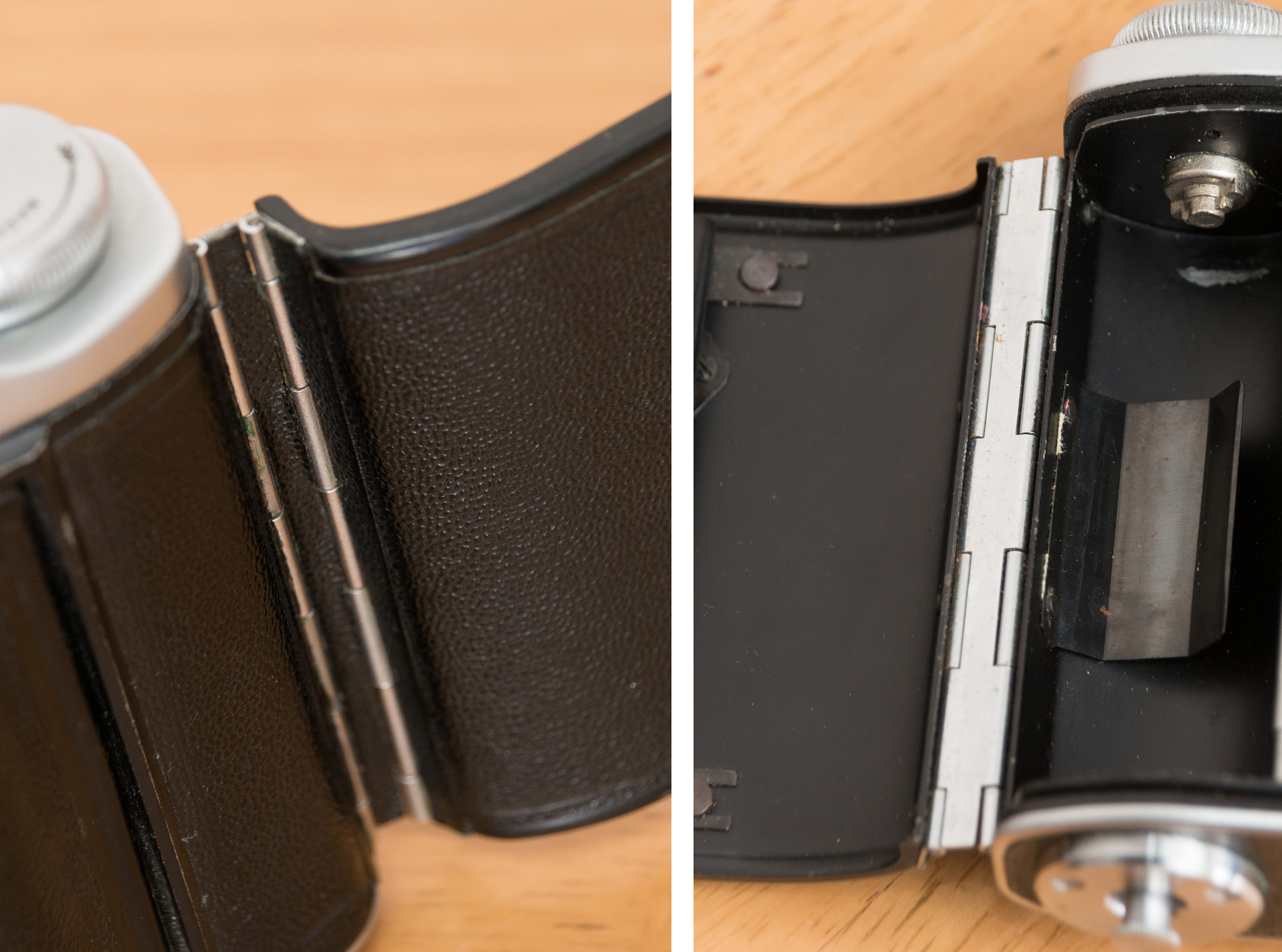 裏蓋の蝶番は2連になっていて、270度近くまで大きく開くようになっている。とはいえ、これにより非常に使いやすくなったとも言いがたい。蝶番部分からの漏光を防ぐためであったのかもしれない。