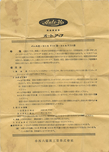 このオートアップは、以下に示す取扱説明書に書かれているように、発明者は島田貫一郎、レンズ系の設計はかの有名な小穴純博士によるものです。開発の経緯は当時の写真工業第5号に島田氏自らにより語られており、こちらで読むことが出来ます。かいつまんで紹介すると、島田氏はもともと写真家で光学や工学の知識のないアマチュアでしたが、戦前マミヤ光機創業者の間宮精一氏の写友であったことからマミヤ光機に入社したとのことです。このとき望遠レンズの付いた特殊なマミヤシックスを制作して使っていましたが、このカメラは3mまでしか接写ができず、これを解決するために自作したアクセサリがオートアップのもとになったと語っています。