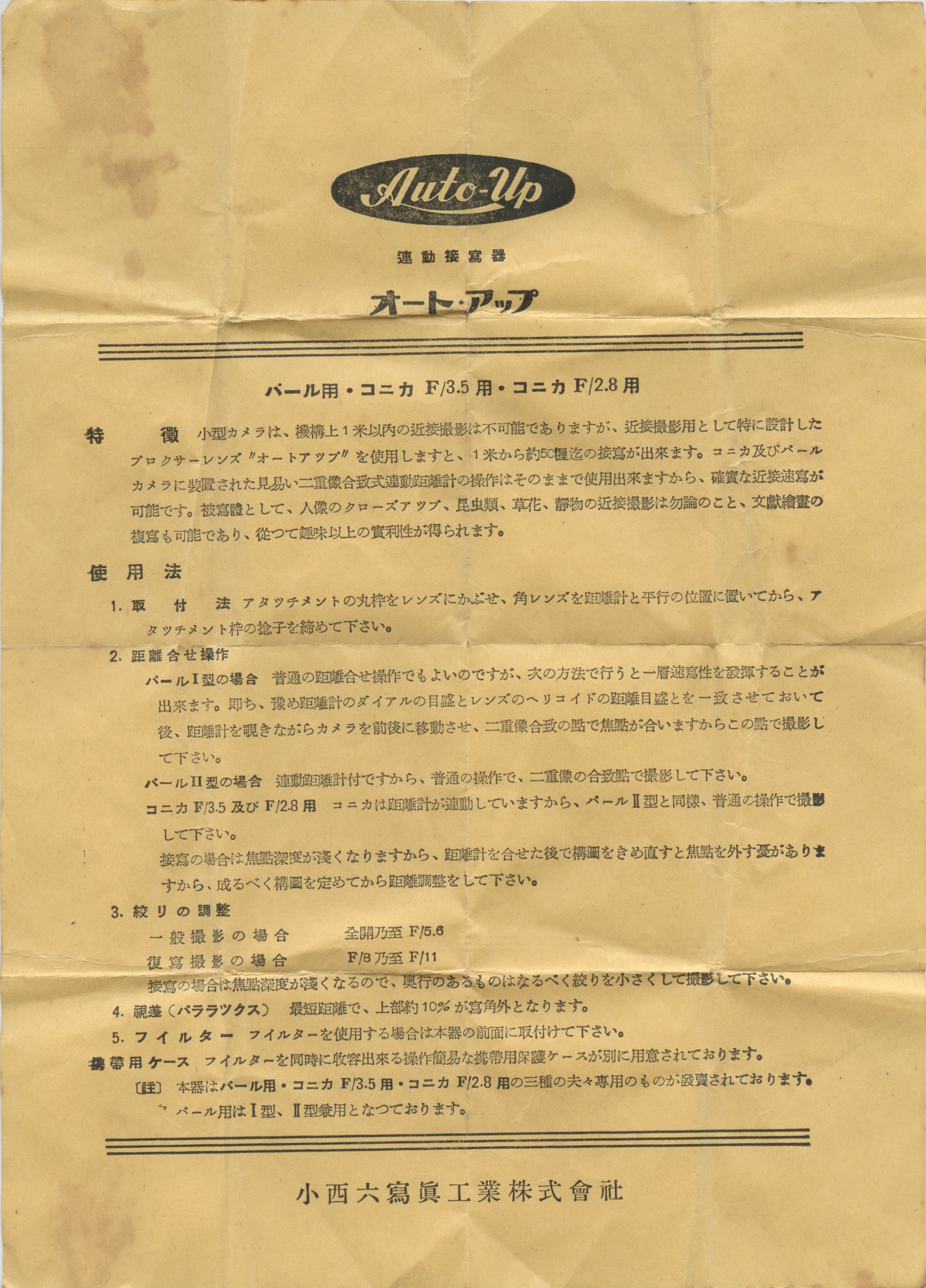 先の説明書にも書かれているように、オートアップには「ユニバーサル」という、バルナックタイプのカメラに使えるものもありました。しかし、このタイプではレンズと眼鏡部分が別になっています。ピント合わせをするとレンズの先端(フィルタ枠)が回転するレンズがあり、この場合はレンズ部分に取り付ける一体型とすることが出来ないためです。取り付けが面倒になりますので、一体型に比べて少しおすすめしにくいタイプと言えます(上のニッカに取り付けてある、ライカLマウント用のニッコールはフォーカシングによりレンズ前枠は回転しません)。また、これまでに述べた機種用の他に、後の新製品に対応したオートアップも発売されています(例えば、パールIV用。詳細はこちらの画像掲示板を御覧ください)。
