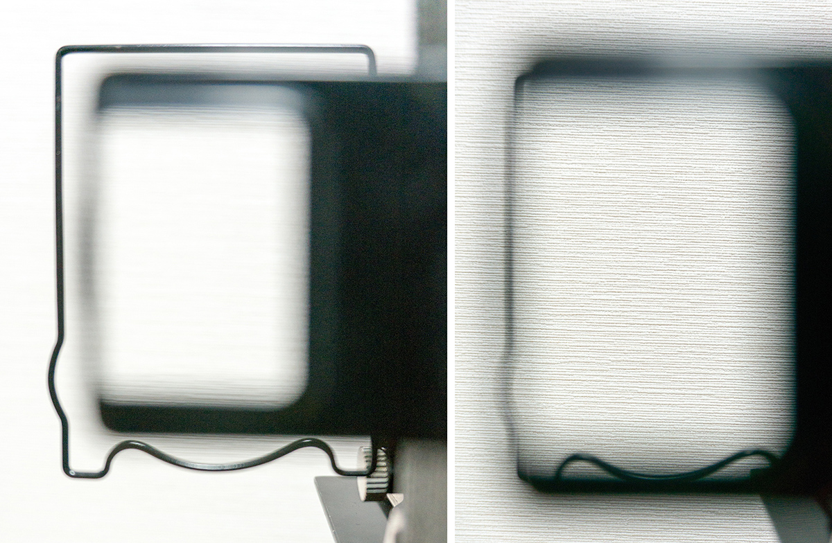 厳密なフレーミングにはピントグラスが良いが、遠距離であればフレームファインダーも使いやすい。アヴスのフレームファインダーは接眼側の枠が大きく、目の位置が正しく決まらない感じがするが実はそうではなく、手前の枠とレンズ側の枠が重なるような位置に眼を持っていくことで正確なフレーミングが可能となるタイプである(上の写真で、左は眼を近づける前、右は目を正しい位置に置いた時の見え方である)。この方法では枠から眼球までの距離が長く、カメラにロールフィルムホルダーをつけた時でも比較的無理なくファインダを覗くことが出来る(Patent Rollex は真中付近が凹んでいて鼻が干渉しにくいのも助かるポイントである)。フレームファインダーはレンズと同じように動くため、シフト時の撮影範囲も確認可能であるというメリットもある。また近接時の画角の変化も再現されるが、パララックス補正は行われない。