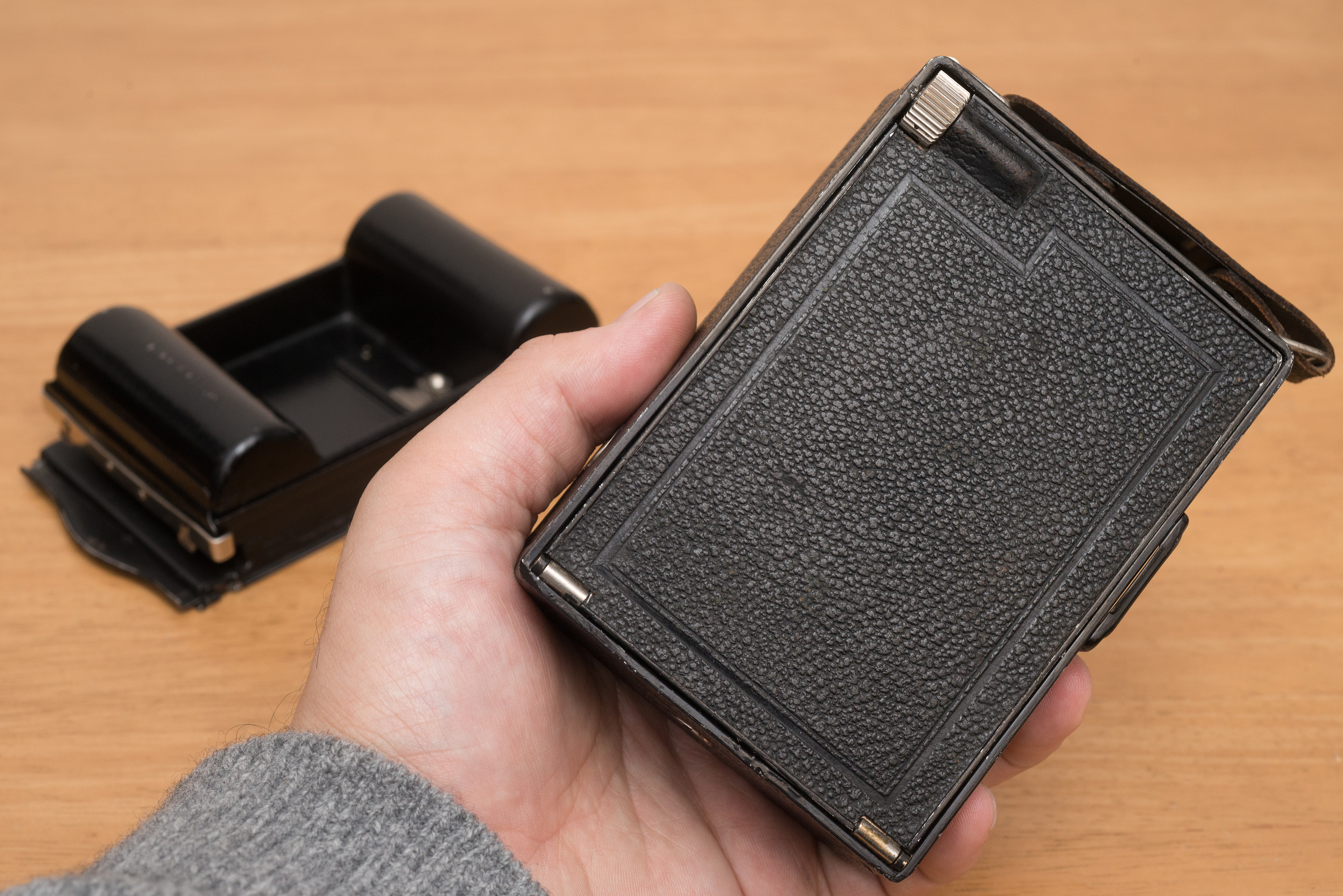 大名刺判用のフォクトレンダー・アヴスに、リンホフ・スーパーテヒニカ69用コンバーチブル・ジンマー 105mm F5.6 を装着したところ。右は大名刺判カットフィルムホルダーの代わりに装着できるロールフィルムホルダーの Patent Rollex。
