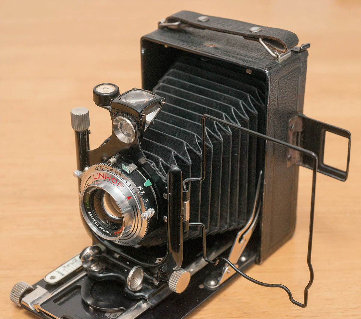 もう1点、どうしても実現したかったことは、レンズを装着したままカメラの蓋を閉じることである。この頃のレンズは薄型のものが多く、後の時代の大型化したレンズはほとんどの場合、蓋やピントグラス、蛇腹などと干渉してしまう。そこでなるだけ小さな、しかし定評のあるレンズをということで、リンホフ・スーパーテヒニカ69用のコンバーチブル・ジンマー 105mm F5.6 を購入した。このレンズは前玉を外すと 185mm F12 のレンズとしても使うことが出来る(そのためコンバーチブルと呼ばれている。ただし望遠時の描写は若干ソフトになると言われている)レンズで、レンズ固定式のこのカメラにはその点でも都合が良い。このレンズにはシャッターに LINHOF の銘があり、またレンズ本体にもシュナイダー銘のほかに TECHNIKA と書かれているが、このようなレンズは一般に「リンホフ・セレクト」と呼ばれ、製造元の基準よりも厳しいリンホフ独自の基準で厳格な受入検査がされたレンズであることを示している。