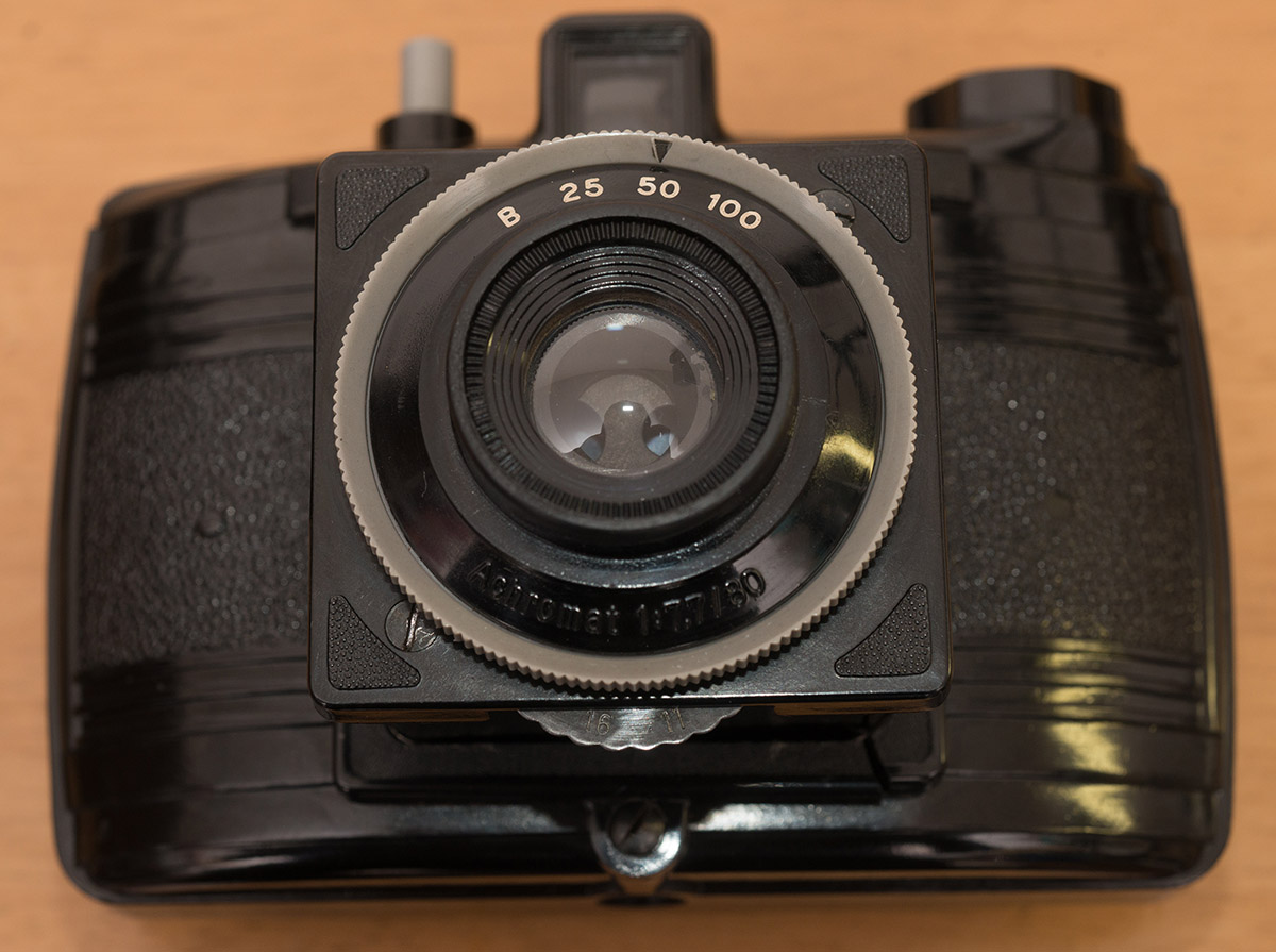 逆に驚くほど割りきった部分も見受けられる。まず、なんとフォーカシング機構がない。レンズは 80mm F7.7 のアクロマート(1群2枚の色消し単レンズ)であるが、さすがに中判カメラであるから、目測でもよいのでピントが調整できたほうがよいのではないだろうか。。。また、裏蓋ははめ込み式でロックがない。取り外すには一方に指をかけて引っ張るだけである。しっくりとはまり、クリックもあるのでさほど不安もないが、割り切りの激しいカメラである。その割にシンクロターミナルが四角い沈胴鏡筒の脇についていたり、赤窓の向こう側に赤窓を塞ぐシャッターが出し入れできたりと妙なところはこだわったカメラである。