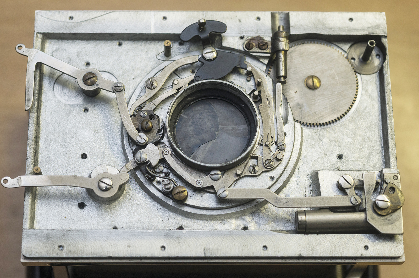 こちら にあるシャッター内部の写真を180°回転したものと比較して欲しい)。通常のシャッターではレンズのすぐ脇を操作しなくてはならないところ、チャージレバー(左上)・シャッターレバー(左下)や絞りダイヤル(右上)をレバーやギアで延長し、またエアシリンダーとシャッター速度ダイヤルはレバーで延長して右下に配置するなど、操作性を向上させる工夫が施されている。