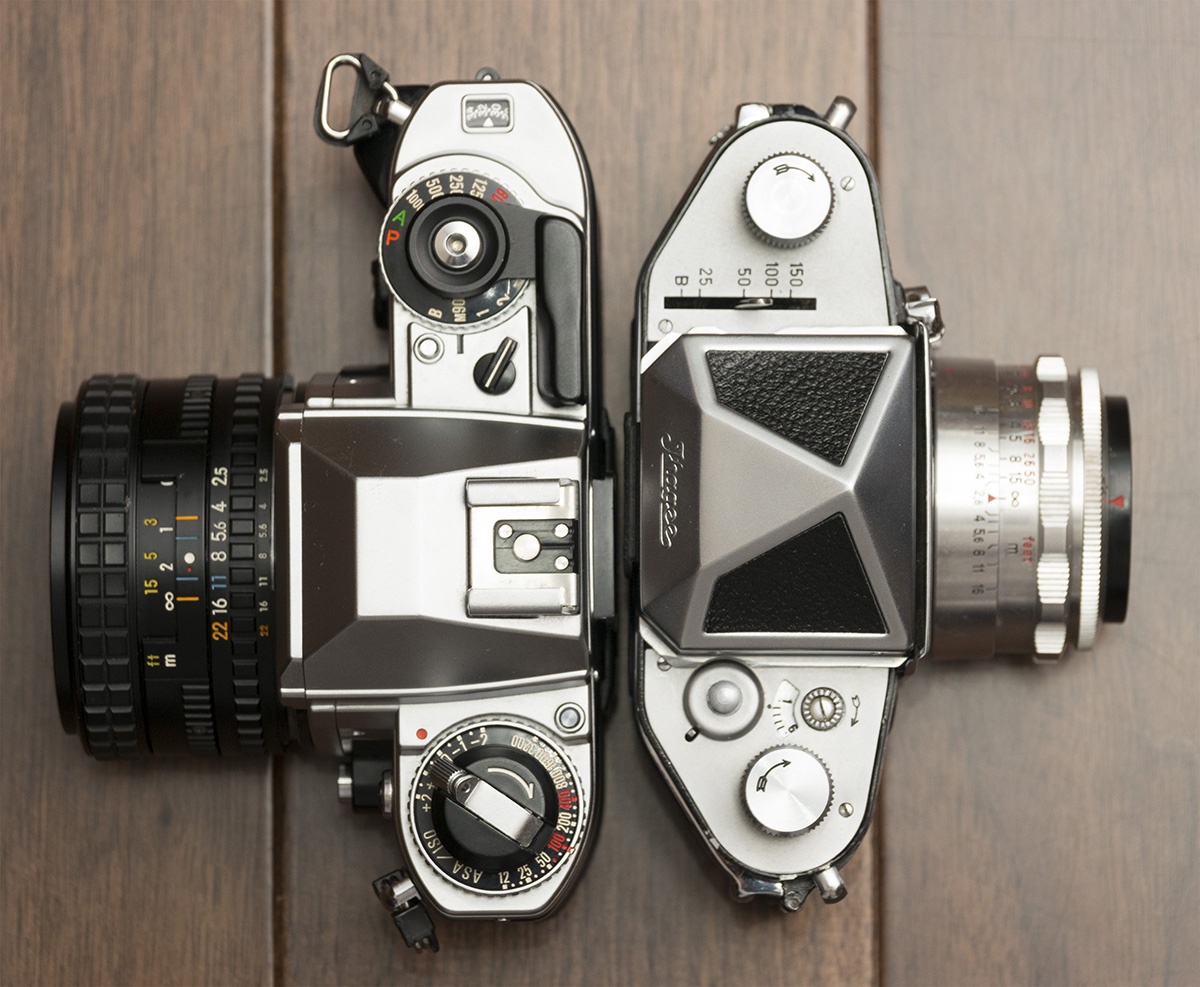 エクサクタマウントのレンズは後の一眼レフのレンズに比べ小ぶりのものが多いため、写真で見るとかえってカメラの背が高く、大きくゴロゴロしたカメラのように感じられる。そこで他のカメラと比較してみた。