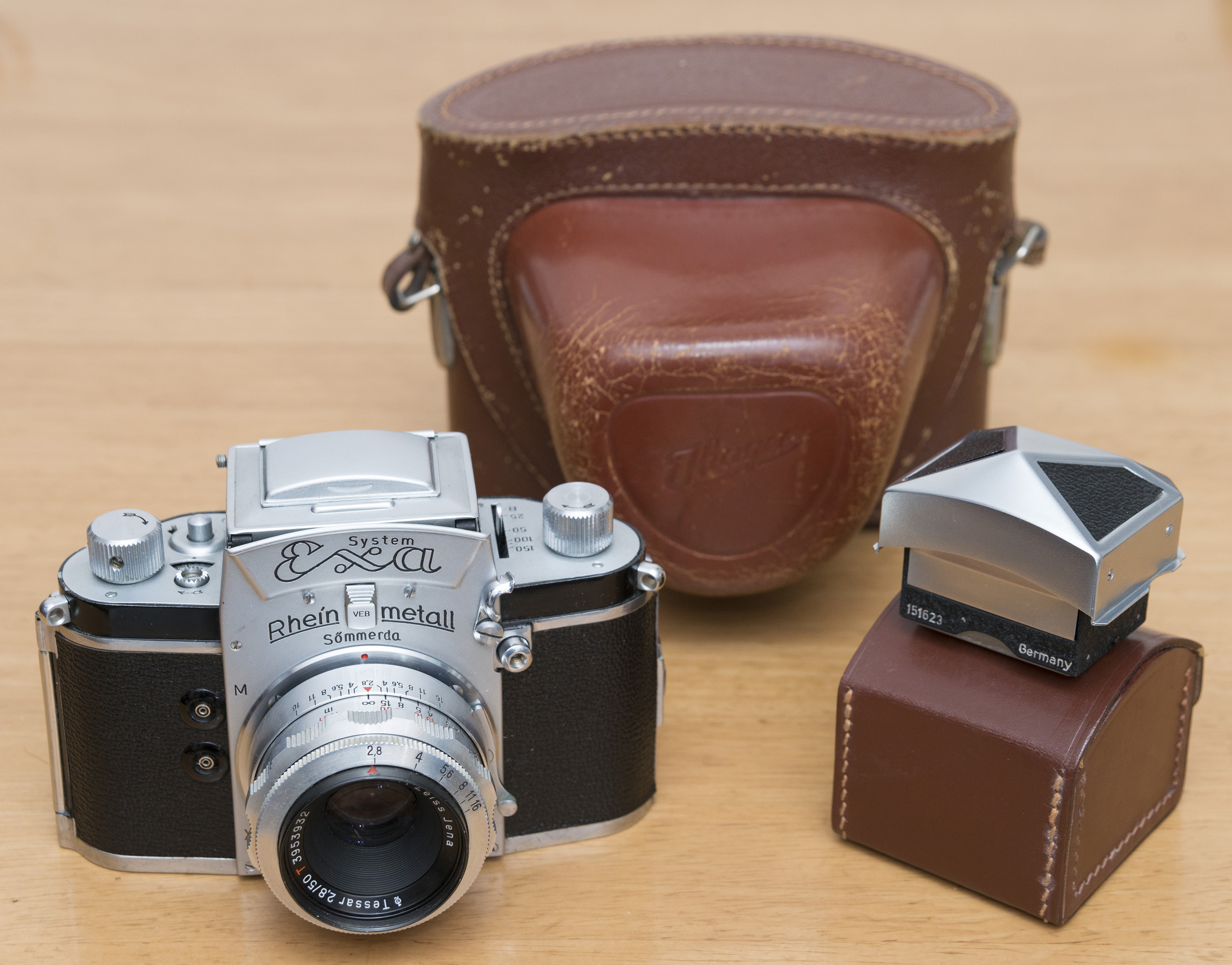 現在のラインメタル社のホームページには社史も掲載されているが、戦後については西側の拠点の経緯にしか触れられていない。しかし東側にも工場等があり、そのうち Sömmerda にあったラインメタル社の工場が1952年に VEB Rheinmetall(ラインメタル人民公社)になったらしい。このエクサにも、ファインダ取り外しレバー(Rhein と metall の文字の間にあるレバー)にVEBと刻まれており、これによりすぐ東側のカメラであることが分かる。Rheinmetall は上記のように主に軍需品のメーカであったが、戦前から機械式の計算機やタイプライターなどの民生向けの小型機械も製造しており、その製造拠点の1つが Sömmerda であったらしい。そして、その流れを引き継いで戦後、ラインメタル人民公社では原付(モペッド)のエンジンなどとともに、このエクサを1年間だけ製造した。