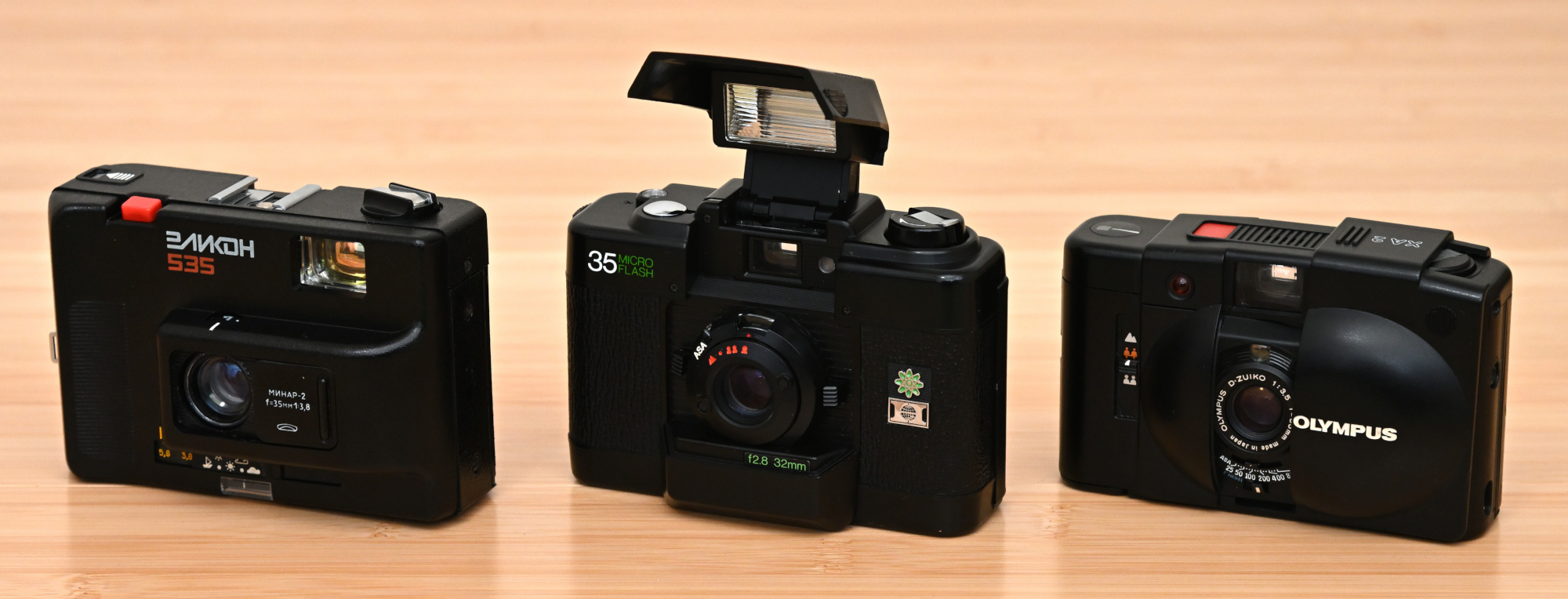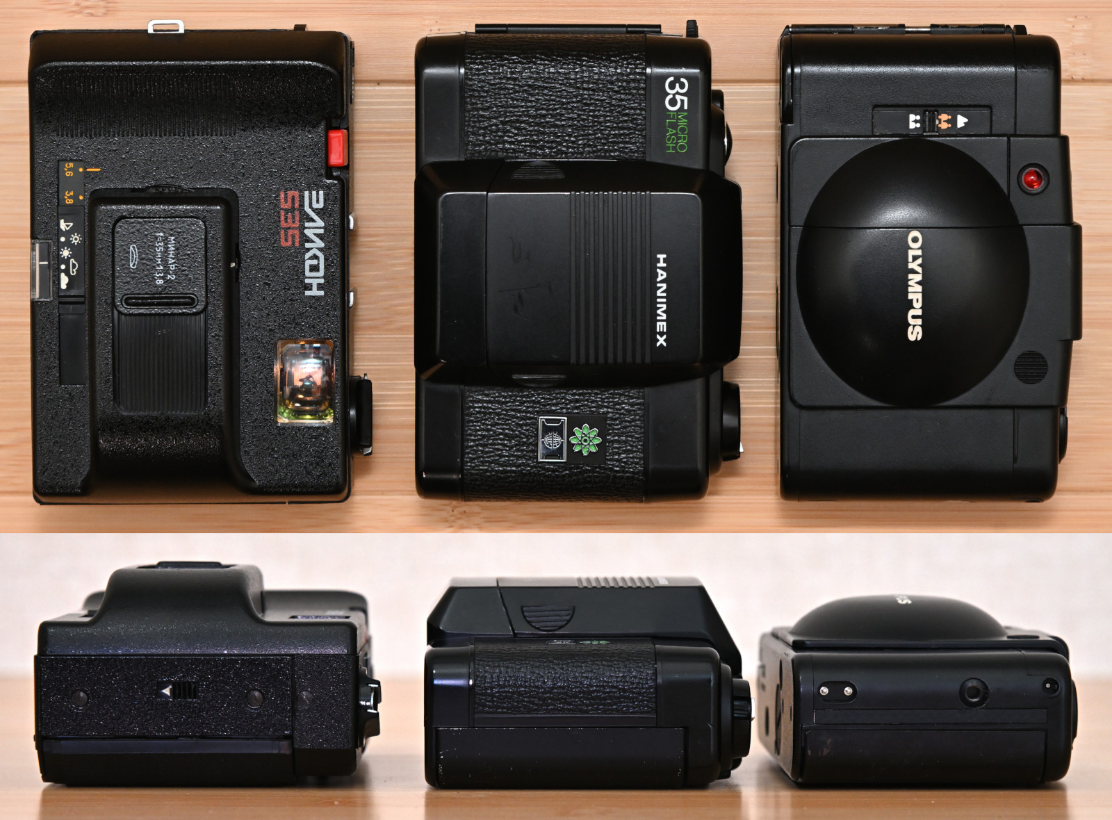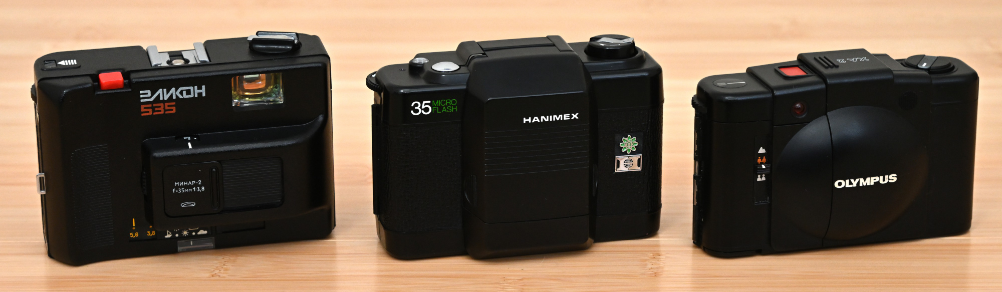 左から ELIKON 535, Hanimex 35 Micro Flash, オリンパス XA2