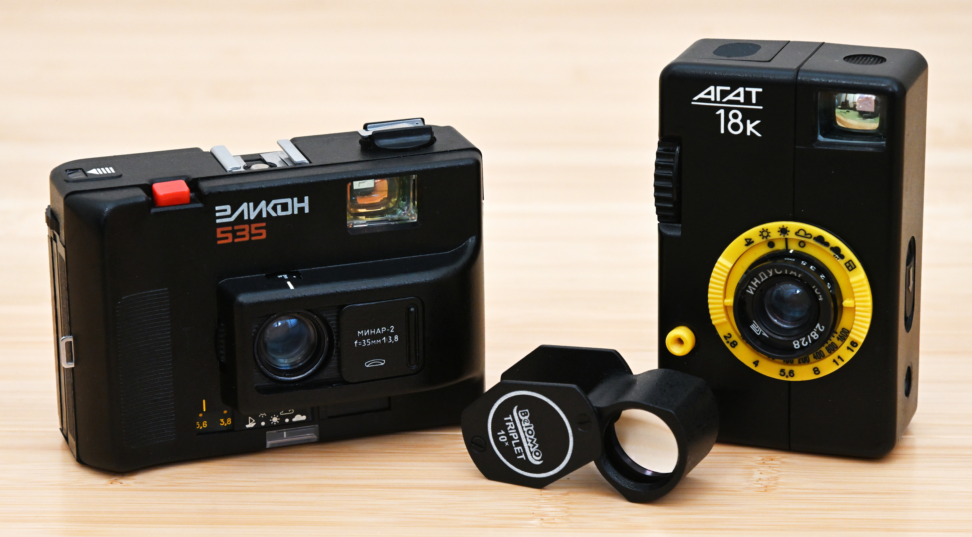 - LOMO SMENA 8M (230g) : 旧ソ連圏のカメラの中ではよく知られたカメラであり、レンズ鏡筒に金属製のメカニカルシャッターが組み込まれたオーソドックスな形態のカメラである。ただし、シャッターチャージがフィルム巻き上げに連動しておらず、多重露光防止機構もないため、チャージし忘れでシャッターが切れなかったり、空写し・多重写しミスのリスクがある(逆に言うと、それを楽しむことが出来る)。オーソドックスな構成のため、シャッター速度と絞り値はそれぞれ独立に設定出来る。フィルム感度を決めるとF値が決まり、天気マークを合わせるとシャッター速度が決まるという方式だが、F値やシャッター速度はそれぞれ別途記載されており、天気マークを無視して自由に設定できるのは ELIKON 4 など旧ソ連圏カメラの美点である。