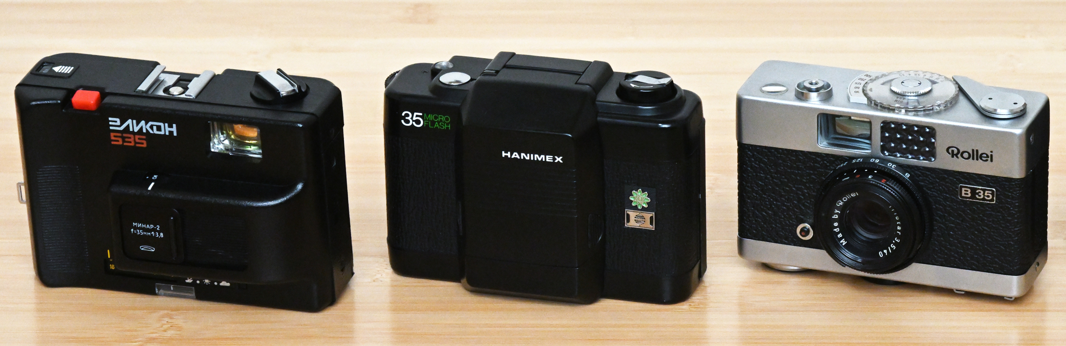 左から、BelOMO Elikon 535, Hanimex 35 Micro Flash