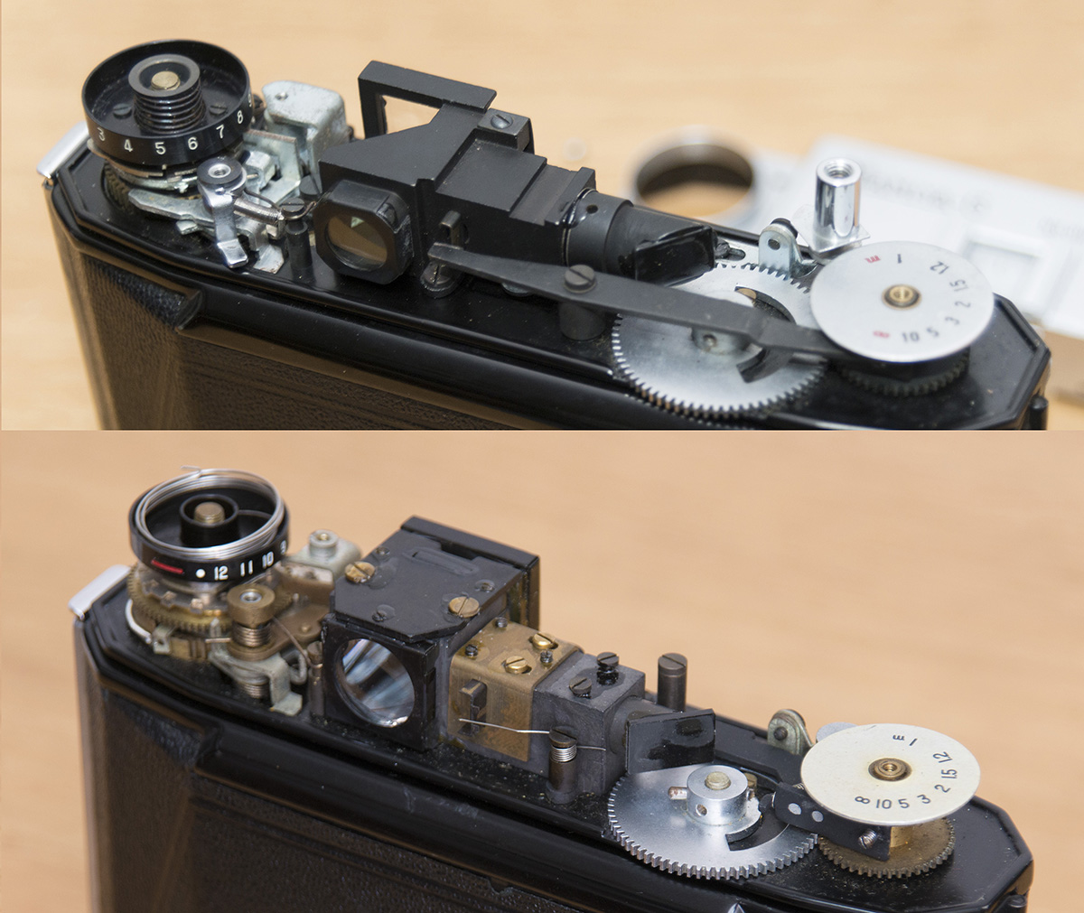 上の写真は前期型(左)と後期型(右)の内部である。後期型では裏蓋を開くと、バネ(カウンター文字盤の内側の銀色のバネ)の力でフィルムカウンターが逆方向に回転して元の位置に復元するが、前期型では裏ぶたを開けてから巻き上げノブを回すことで(フィルムを装填するときの自然な動作で)フィルムカウンターが順方向に回転して初期位置に復元される。またフィルムカウンター文字盤の回転方向も逆になっていて、前期型では巻上げノブと同一(時計回り)であるのに対し、後期型では逆回り(反時計回り)に動く。上の写真でも、文字の並び順が逆になっていることが分かるだろう。フィルムカウンター復元時の表示も前期型では赤色の帯で表示されるのに対し、後期型では細い白線になっている。後期型では単に巻止解除レバーが省略されただけでなく、フィルムカウンター部分の内部構造が根本的に変更されている。距離計やセルフコッキングまわりの構造に変更はない。
