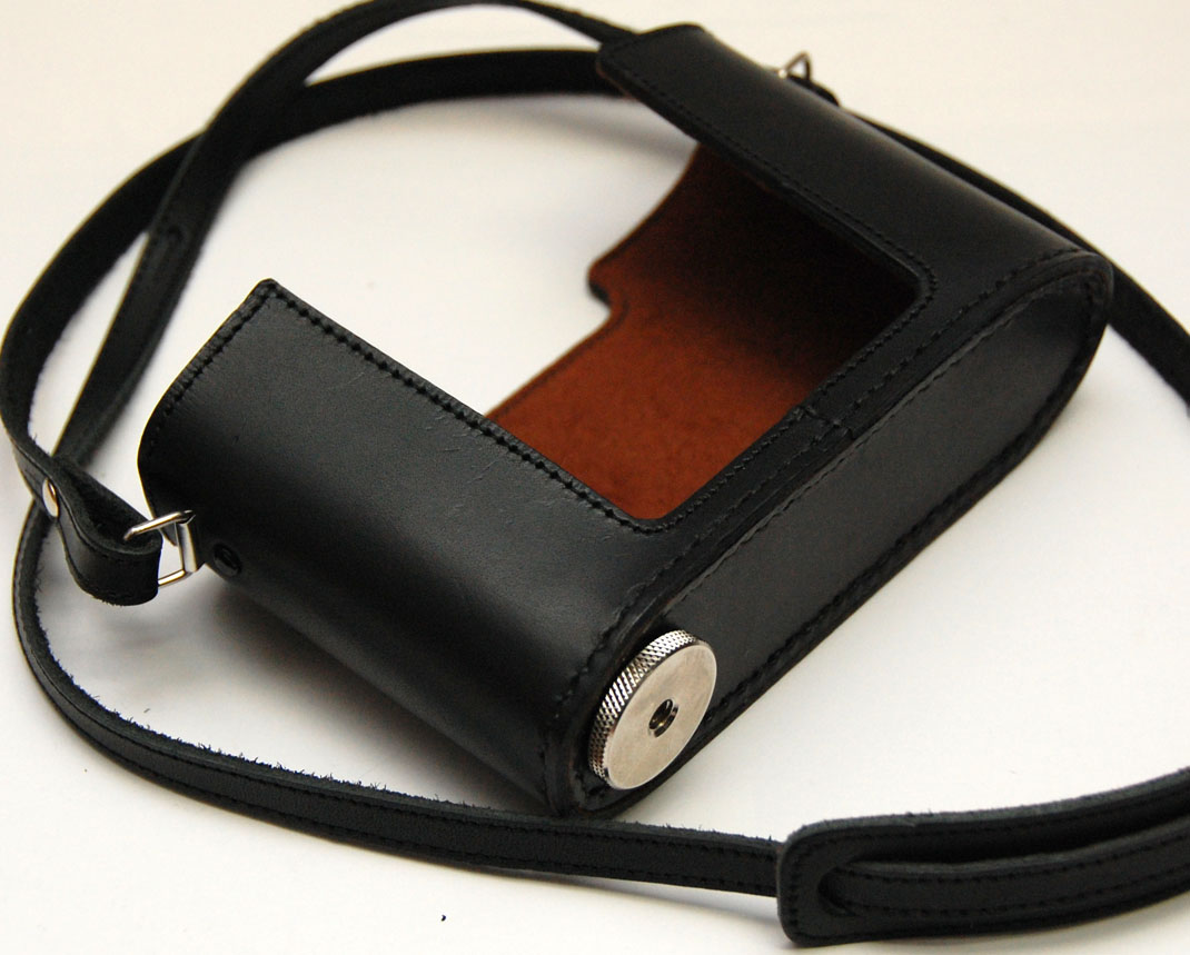 カメラ。ヒラノ にこのカメラを送って作ってもらった。ごらんの通りとても良い出来でしっかりしており、真新しい革の香りもすがすがしい。背面については、ピント合わせに支障がないように少し高さを下げていただいた。またさらに、私の好みでストラップ部分には長さ調整金具を付けないように製作していただいたが、このように細かい注文にも応えていただけるのが1点製作のまた良いところでもある。