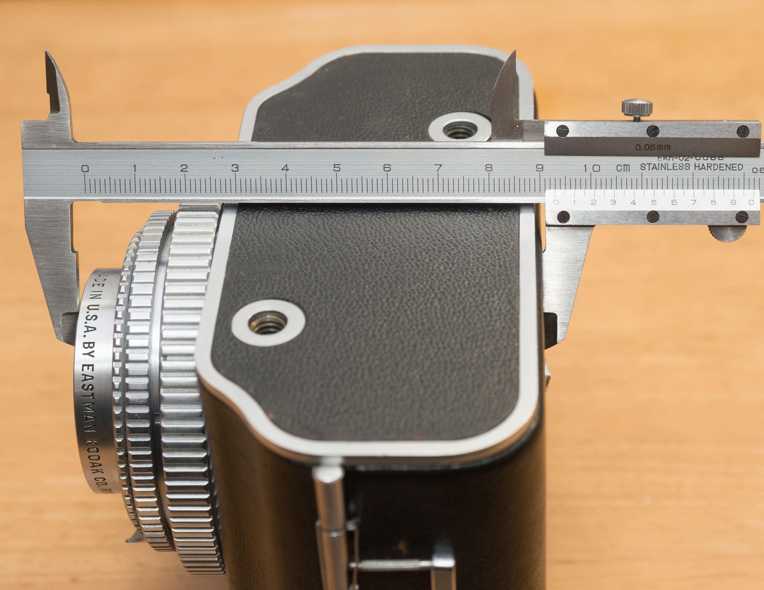 メダリストは沈胴機構を備えているため、レンズを含めた全体の奥行きも小さい。レンズの焦点距離が100mmであるのに対し、沈胴時の奥行きは93mmしかない。この状態では撮影はできず、レンズを繰り出していくと無限遠位置(奥行き121mm、最初の写真の状態)となり、さらに繰り出すと最短撮影距離の3.5フィートで奥行き132mmとなる。沈胴時の奥行きは、35mmカメラに50mmF1.4標準レンズを取り付けたときの奥行きよりも小さい。メダリストは、蛇腹を用いない69判カメラとしては(または、セルフコッキングを備えたカメラとしては)小さなカメラだと言えるのだ。もちろん、120よりも細身の620フィルムを用いるカメラだということはあるが、それだけでは説明の付かない小ささを実現しているカメラである。
