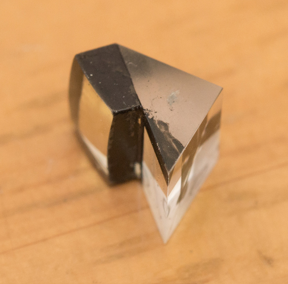 メダリストはファインダと距離計が分かれた「二眼式距離計」であり、バルナックライカとM3の関係を見るまでもなく、この形式は時代遅れのものだと思われがちである。しかしこれも、メダリストのファインダの思想を知ると誤った理解であることが分かる。メダリストでは、ファインダの像と距離計の像が同時に観察できるように作られている。さきのファインダ像の画像は2枚の写真を合成したものではなく、ファインダ接眼部付近にスマートフォンを近づけて一度に撮影したもので、ファインダ像と距離計像の位置関係も覗いたときそのものの見え方である。つまりファインダ全体像のすぐ下に距離計の像が見えるが、これはただ単に距離計の窓がファインダの窓に近いからそう見えるだけではない。距離計の接眼側の光軸はファインダの光軸と平行ではなく斜め(前下がり)になっており、接眼窓から 20mm ほど離れた適切な位置に目を置くと、その位置にファインダからの光と距離計からの光が集まるように設計されている。上の写真のプリズムは距離計を構成する5個のプリズムのうち最後のプリズムであるが、このプリズムに貼り付けられたレンズ(黒色部分)が斜めになっていることが分かるだろう。これにより、プリズムから出た光線が斜め上へ屈折され、ファインダを覗く眼球の位置へ届けられるのだ。つまり、確かに接眼窓は2個に分かれているが、ファインダ像と距離計が同時に観察できるという意味では一眼式距離計であり、ファインダに距離計を組み込むタイプに比べ被写体そのものを見るのに悪影響がないばかりか、距離計の倍率を高くすることによって測距精度も高められているのだ。