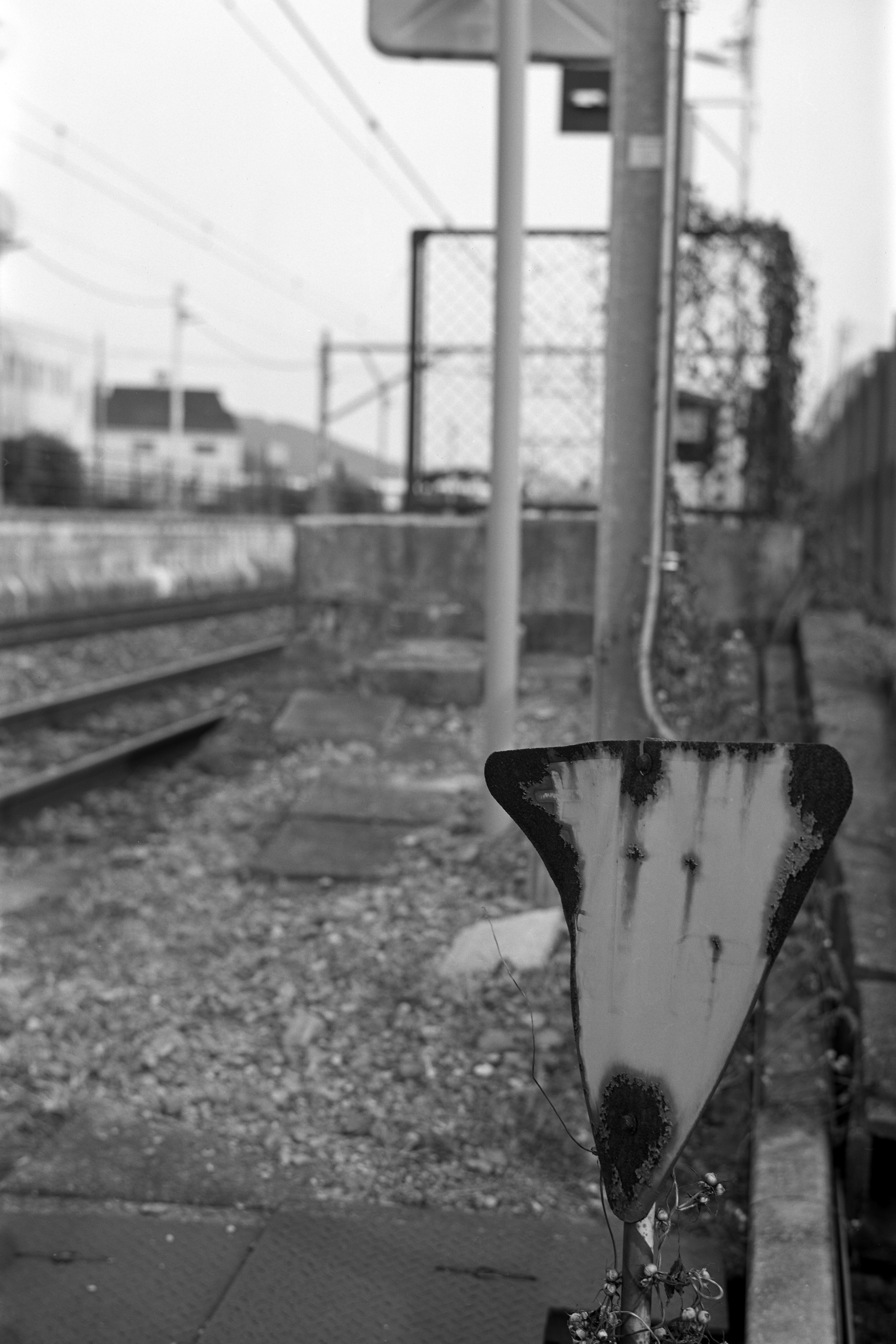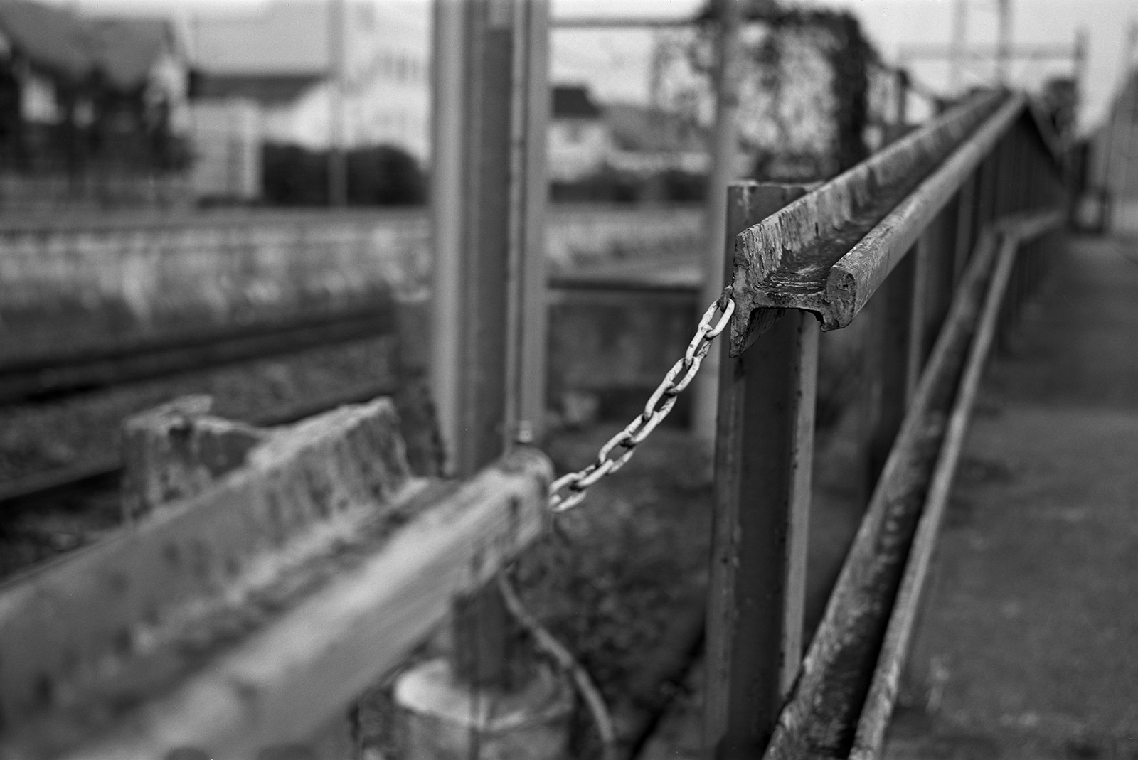 最初の写真と似たような条件で、やはりレールを再利用して作られた柵の突端にピントを合わせた。このような絵作りが一眼レフでなくても可能、というのは痛快である。