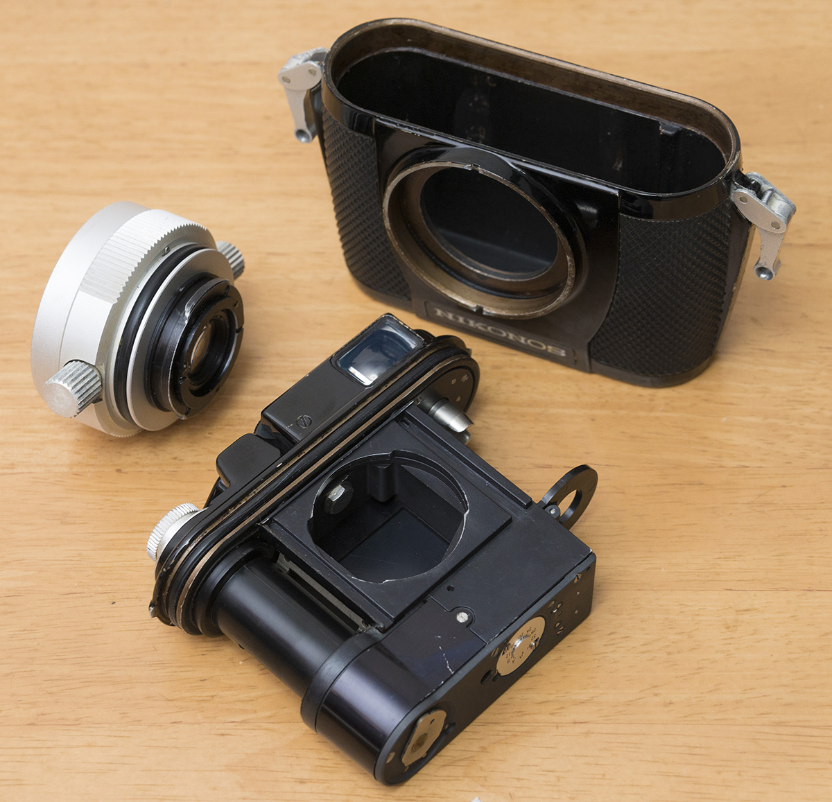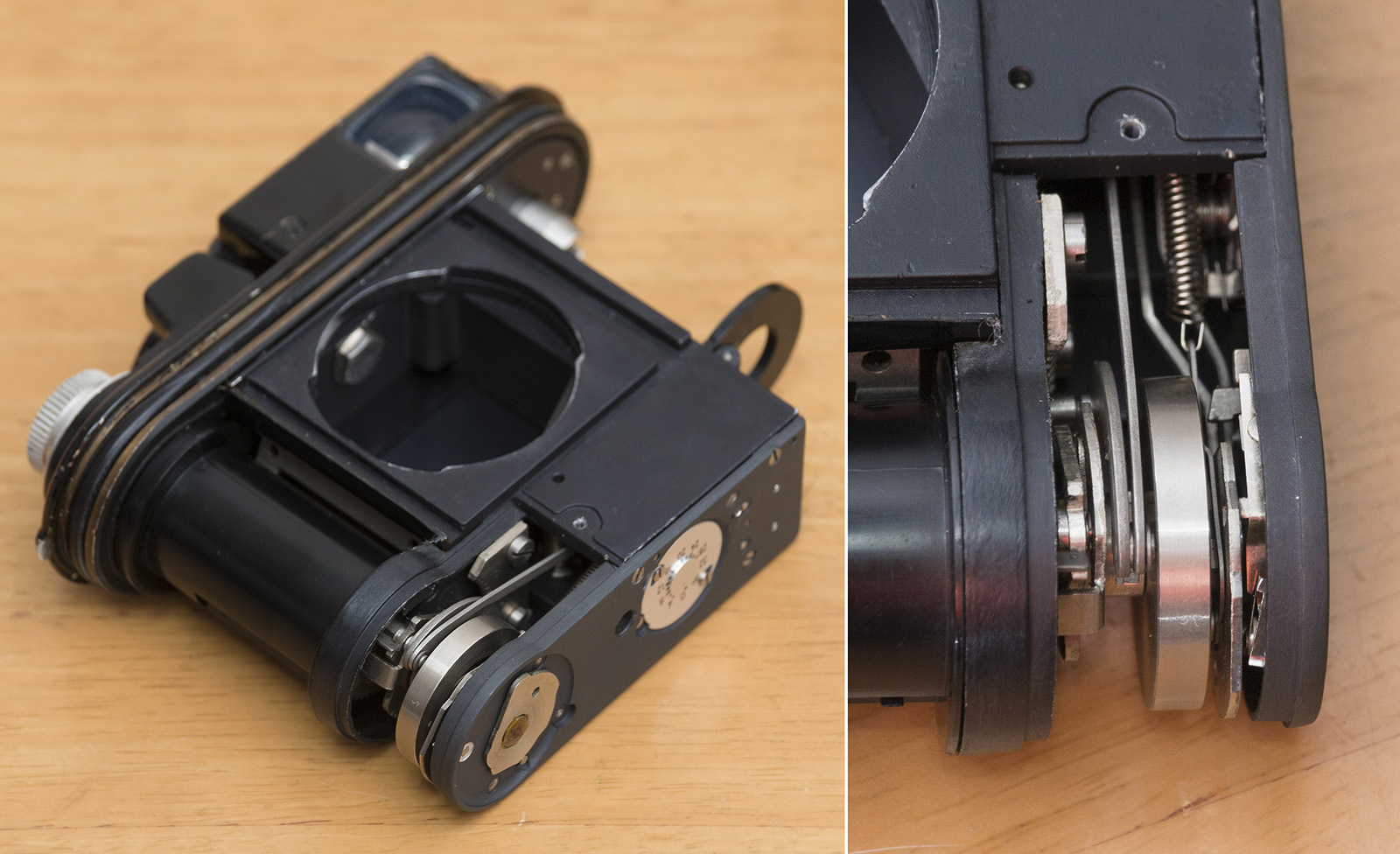 この内部機構のシャッター制御部にわざわざカバーが付けられているのは、やはり、フィルム交換時には必ず目に触れる部分であり、内部機構と言っても事実上はボディそのもののような扱い方をされるからであろう。初代のニコノスではフィルム圧板は固定されており跳ね上げることが出来ず、フィルムは下側から差し込むようにして装填される。II型以降ではこの圧板は跳ね上げられるように変更されるが、私見では、シャッター幕に触れて壊してしまうような事故を防ぐという意味で、この固定圧板方式は1つの見識であったように思われる。