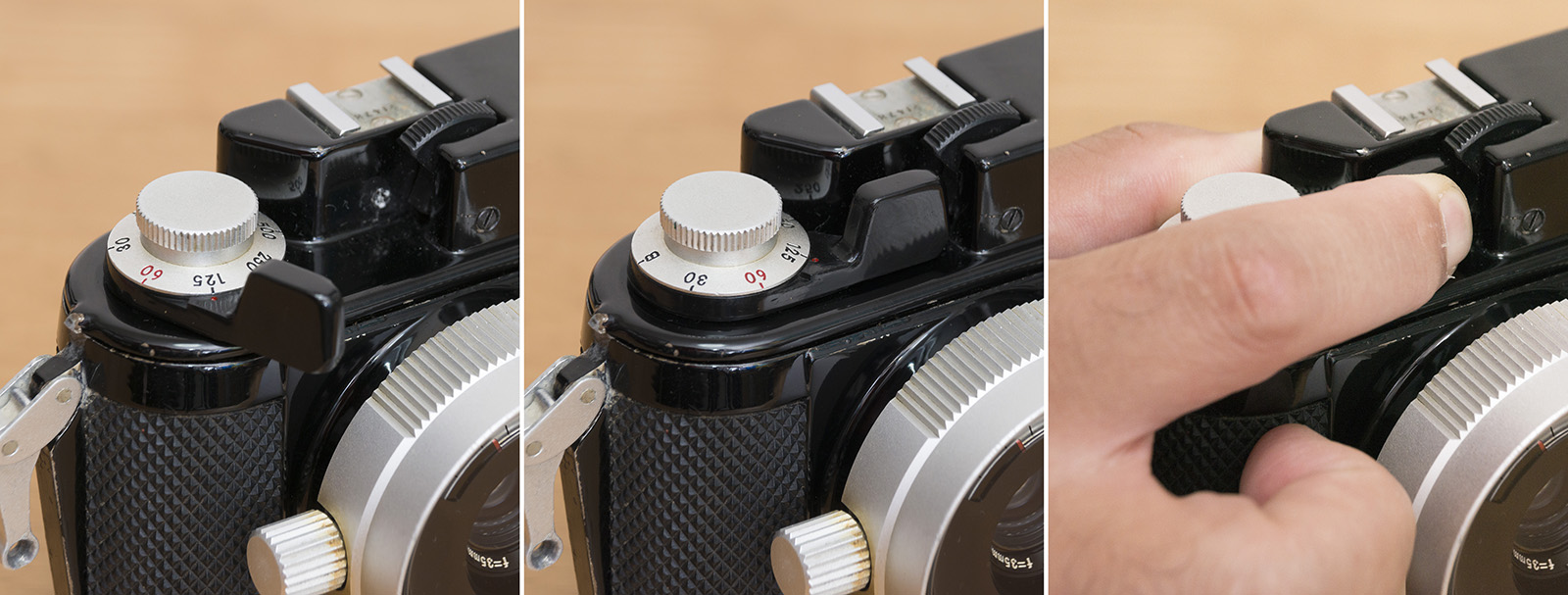 シャッターボタンの奥にあるレバーはシャッターロックレバーであり、ボディ内部にはなんら繋がっておらず、単にシャッターボタンの押し込みを物理的に防ぐためのものである。シャッターが不用意に切れないようにするほか、フィルム装填時にフィルムを空送りするときにも利用する。