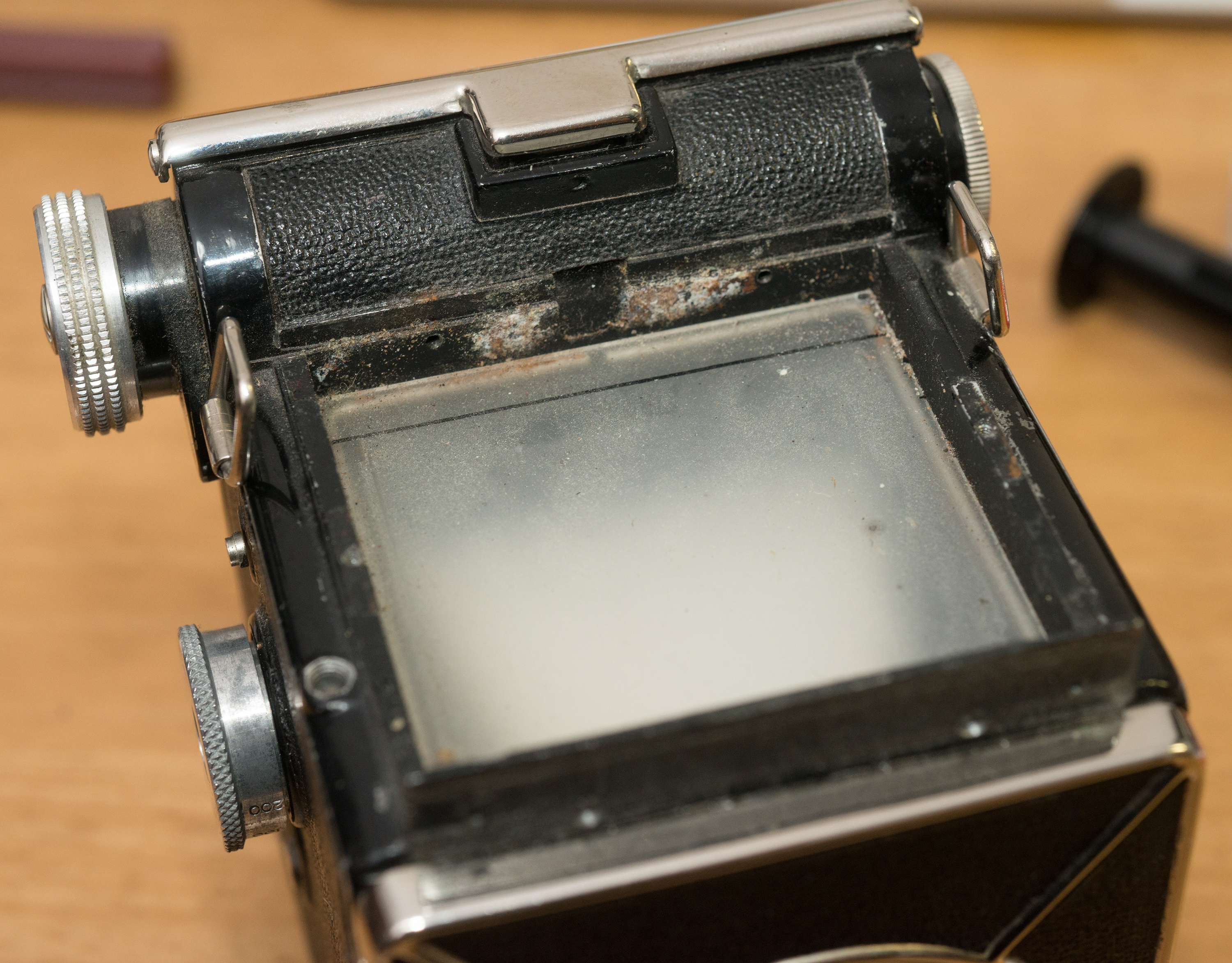 ファインダフードを取り外した時の様子である。この他にもあちらこちらで錆が見られた。幸い、ミラーの腐食はさほど進んでおらず、そのまま利用することにした。ファインダスクリーンはガラス製であるので、割れていなければ傷だらけで見づらいということはあまりないかと思われる。ただしフレネルレンズが用いられていないので周辺部は見づらい。