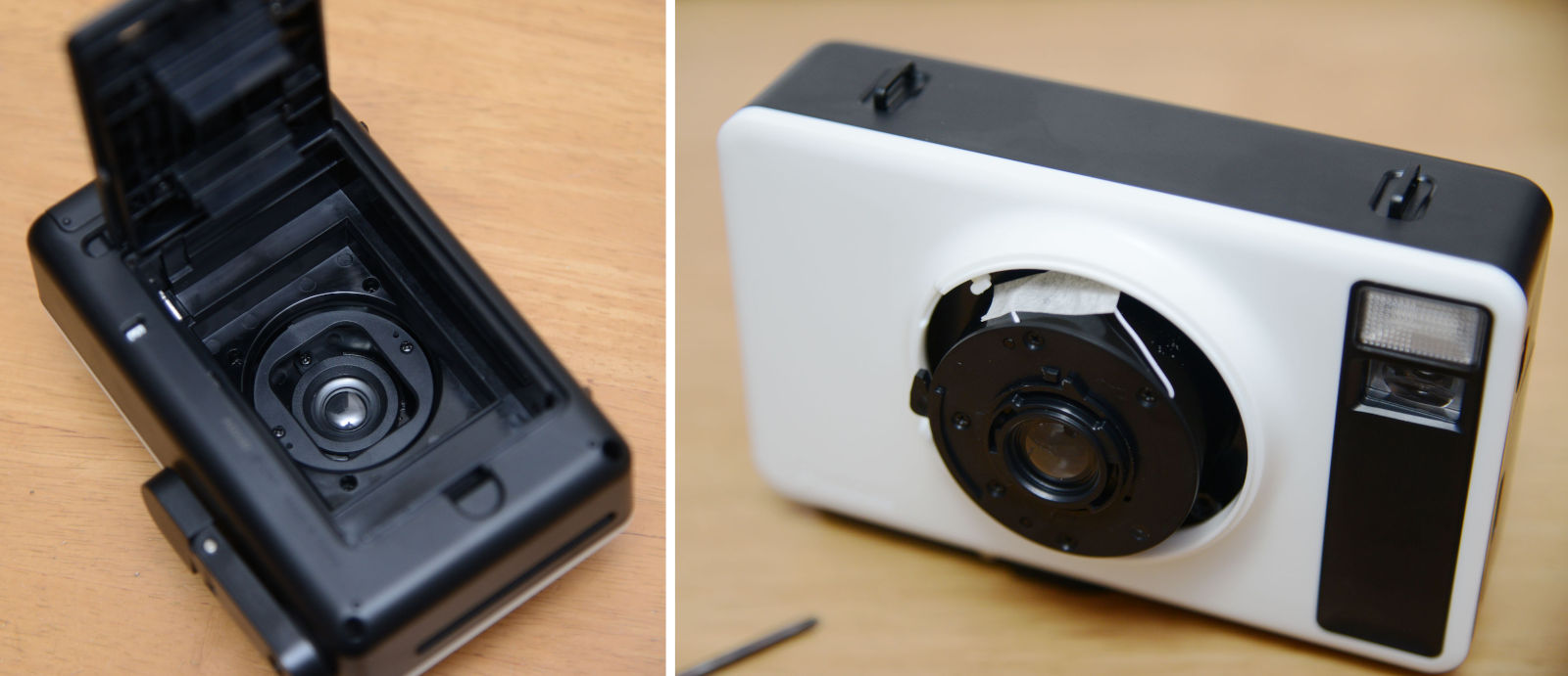 普通はまずそこで一通り撮影してみてから改造なりなんなりするところだが、いまさらインスタントカメラ(チェキ)で撮るものもないし、ということで、一コマも撮影することなく改造について検討。このカメラは Instax miniのフィルムを使うので、画面サイズはほぼ 6x4.5判と同じである。そこでレンズマウントとシャッターを付けて手持ちのちゃんとしたレンズを付けてみるとか、逆にボディを切ってしまって中判カメラの後部にくっつけるポラロイドバックを作ってみるとか言うのも考えたが、大工事になるし、ピント合わせのことなどを考えるとそう簡単ではない。その点、ピンホールカメラであればすぐ作れそうだし、長時間露光で遊んでみるのも一興かということでピンホールカメラ化してみた。
