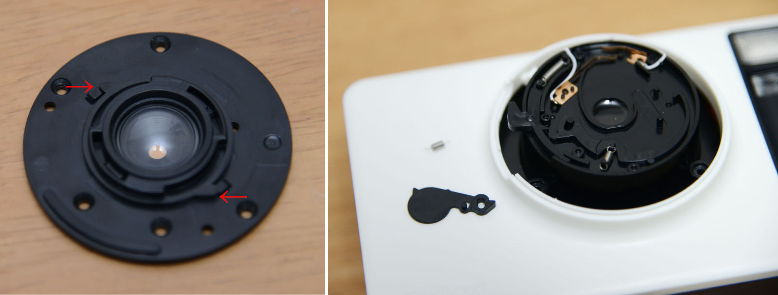 取り外したシャッター前板に、レンズははめ込みで取り付けてある。上図の赤矢印部分が引っかかっているので、この2つの爪を外しながらレンズ外周のプラ部品を反時計回りに回せばレンズ前玉が取り外せる。シャッター内部にはいくつかのプラ部品とバネがある。全部撤去してもよいが、少なくともシャッター羽根は取り外す必要がある。できればここのところに3Dプリンタかなにかで部品を作って、シャッターレバーでシャッターが開閉できるようにしたいが、今回は単に部品をいくつか撤去することにした。