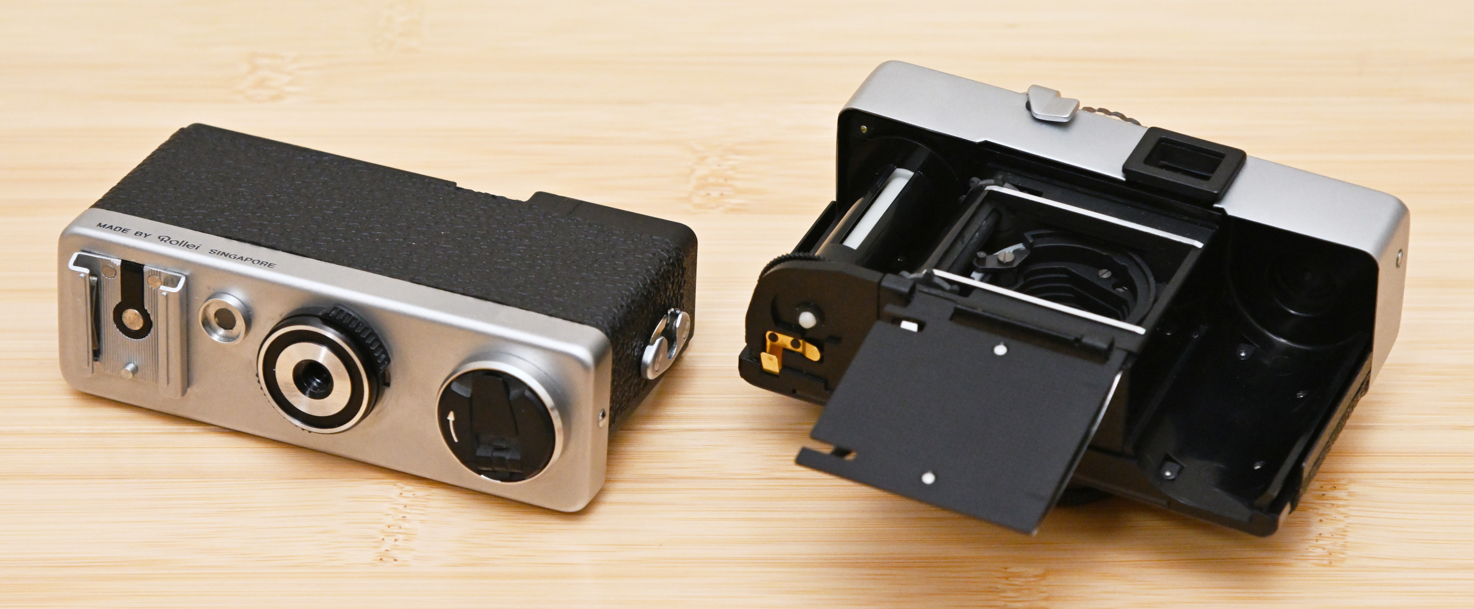 ローライ35では、フィルム交換を行うときに底蓋と裏蓋をまるごと取り外す。この構造そのものはコンタックスやニコン等にも見られた形式であるが、驚くべき点はこの極限的な小型化設計であろう。裏蓋はパトローネから飛び出したスプール軸を除いた高さに抑えられており、その軸が収まる先には露出計の電池が納められる。フィルム送り量を決めるスプロケット(フィルムのパーフォレーションにかかる歯車)は、その幅を節約するため画面の端にギリギリに納められている。