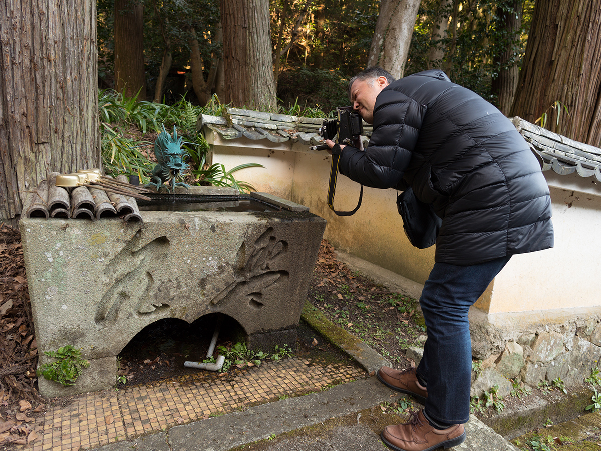 このとき、撮影に同行した弟がたまたまこのカットを撮影する様子を写真に収めていたので掲載しておく。ハンドストラップの代わりに、一眼レフ用のストラップをつけて移動中は肩から下げられるようにしている。