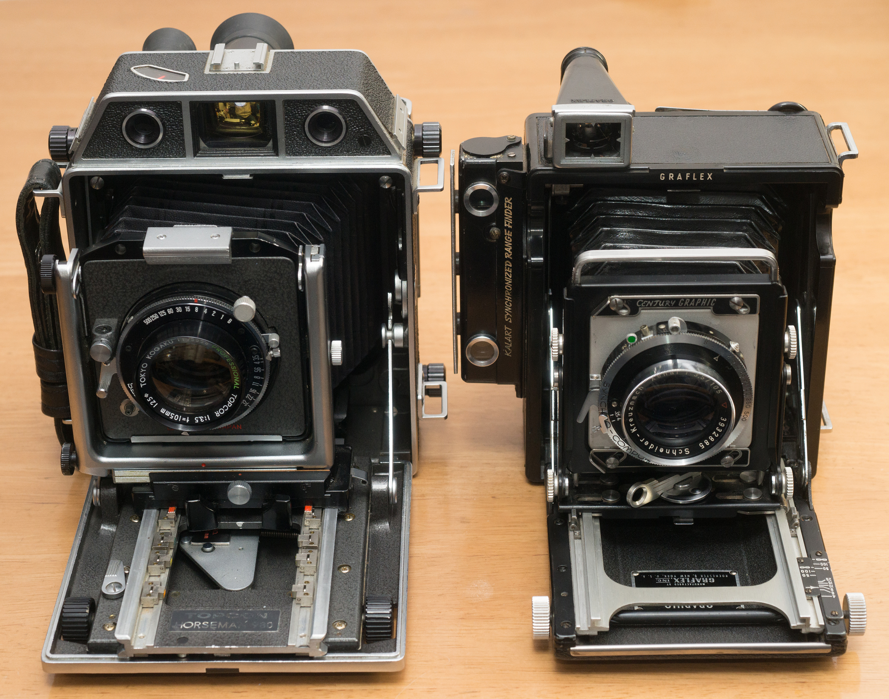 この2つのカメラは互いにかなり似通った部分が多い。それもそもはずで、ホースマンはグラフレックス社のカメラ(と、リンホフのスーパーテヒニカ)を参考に作られたカメラだからである。特に後部のフィルムバック取り付け部はグラフレックス社が開発した規格「グラフロック」をホースマンも採用しており、後に述べるようにこの部分には完全ではないものの互換性がある。そのような中でこれら2台のカメラの最大の違いは、その素材と重量だろう。ホースマンは全金属製で非常にがっしりした作りであるかわりに重く、それに対しセンチュリー・グラフィック23は樹脂を上手に使い、また全体としても小型化を重視して作られている。