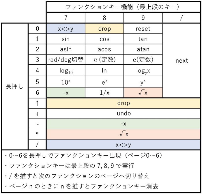 関数電卓は普通、各関数に対応したキーがあるが、そのかわりにこの電卓ではキーの長押しを使うことにした。長押しと言っても必要なのはたった0.5秒で、しかし数値の入力などでカチリと押す場合に反応してしまうこともない。具体的には、0〜6のキーを長押しすると、画面の下段に4つのファンクションキーが現れる。このとき、最上段のキー(7, 8, 9, ÷)を押すと、その機能が選ばれて実行される、ということになる。機能の配置は上の通りで、三角関数・逆三角関数と対数・指数関数(底が10, e, y の3種類)を搭載している。加えて平方根と、RPNの演算で便利な SWAP(スタックトップの2個の数値の入れ替え)、DROP(スタックトップの1個の削除)、符号反転、逆数なども搭載した。これらのうち使用頻度が高い機能はほかのキーの長押しでも一発で呼び出せるようにしてある。